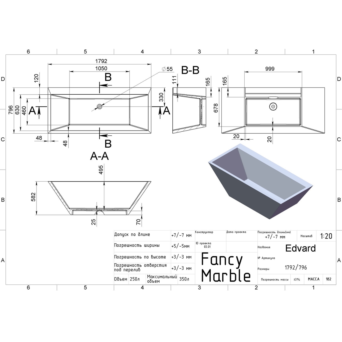 Отдельностоящая ванна из литого мрамора со сливным отверстием в полу. Ванна отличается высокой прочностью, теплопроводностью и может быть установлена у стены или по среди комнаты. Также, возможно окрашивание ванны, внешняя часть и борт, в соответствии с таблицей RAL Kemichal.