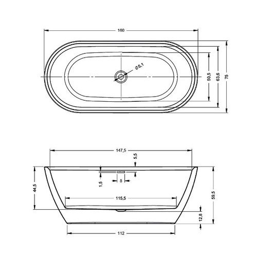 - 160 x 75 x 44.5/59.5 см, объём ванны 255 л