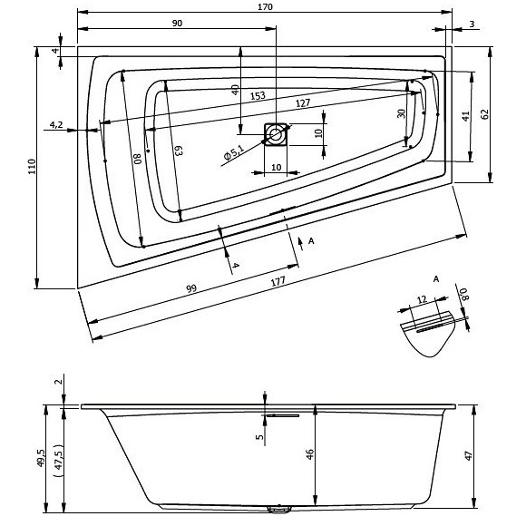 - 170 x 110 x 47.5/49.5 см, объём 240 л