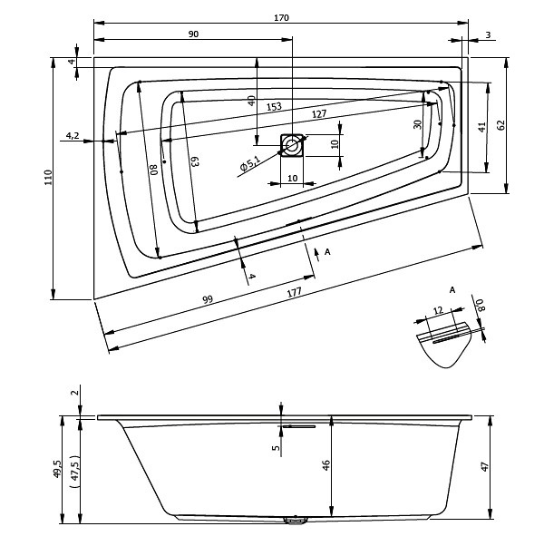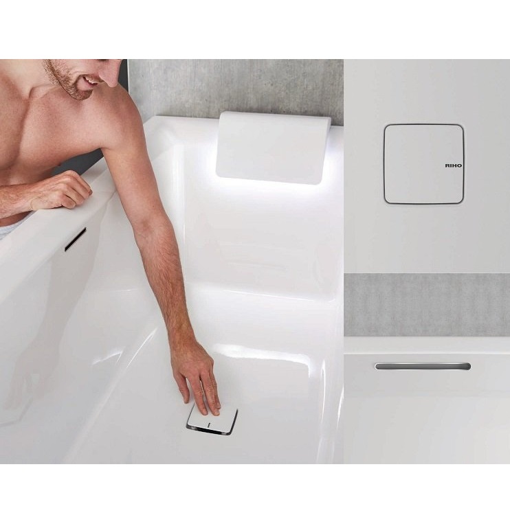 - широкое плоское дно с центральным сливом, позволяющим удобно расположиться на любой стороне ванны