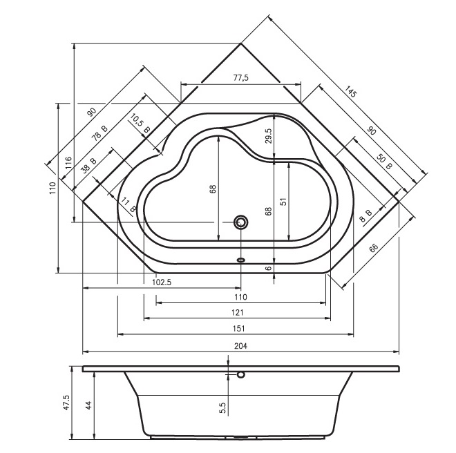 - 145 x 145 x 44/47.5 см, объём 305 л