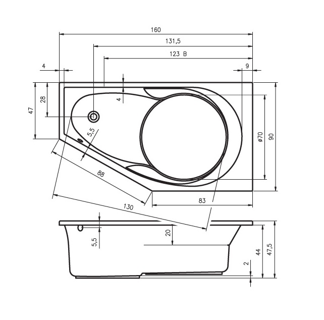 - 160 x 90 x 44.5/48 см, объём 255 л