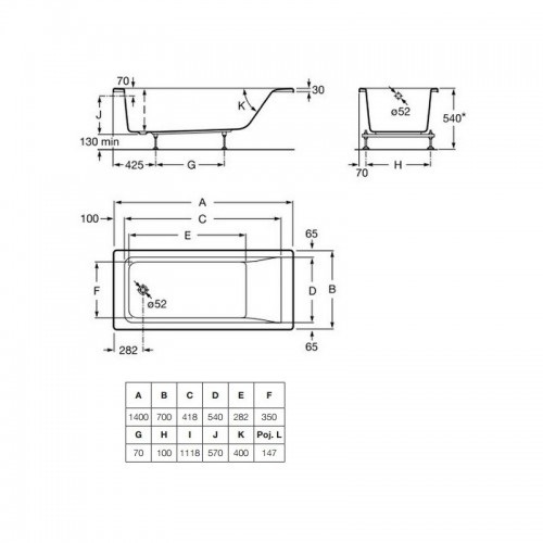 - 1400 х 700 х 410 мм, высота с ножками 540 мм, объем 147 л