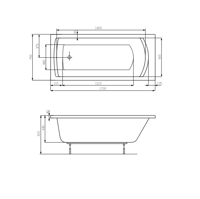 - 1700 х 750 х 430 мм, высота ванны с установленной панелью 560 мм, объем 185 л, вес 28 кг