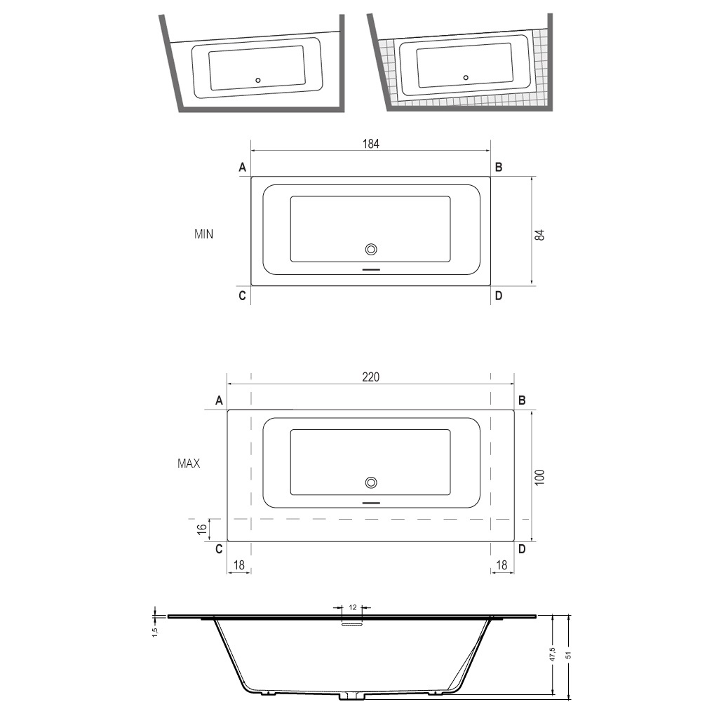 - под заказ возможно изготовление ванны меньшего размера, наименьший возможный вариант 184 х 84 х 51 см, наличие данной опции и ее стоимость уточняйте