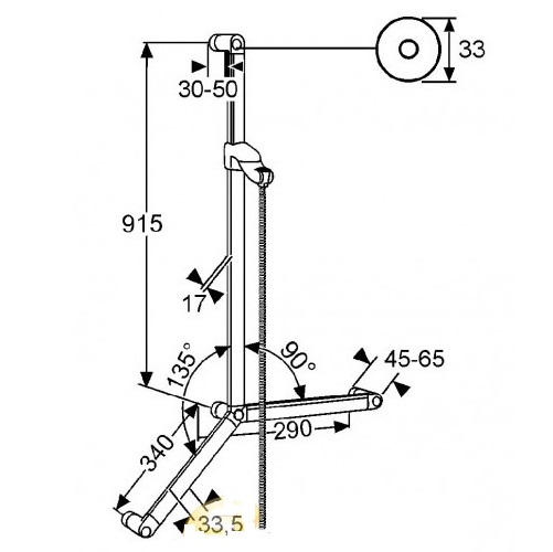 - общая длина 900 мм, длина рычага: 90° = 250 мм, 45° = 300 мм, расстояние от стены 50 мм