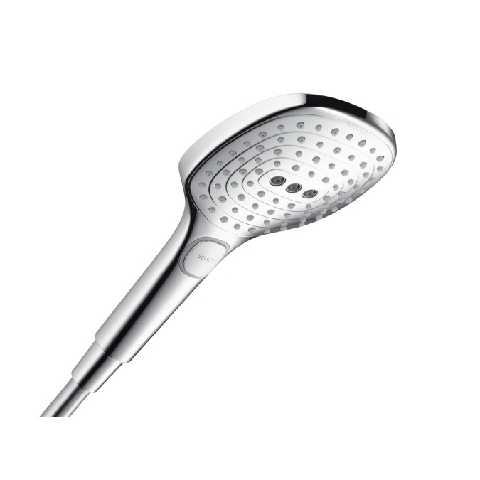 - Размер душевого диска 120 мм (хром, хром/белый), 3 типа струи: RainAir, Rain, массажная струя, переключение типов струи с помощью кнопки Select
