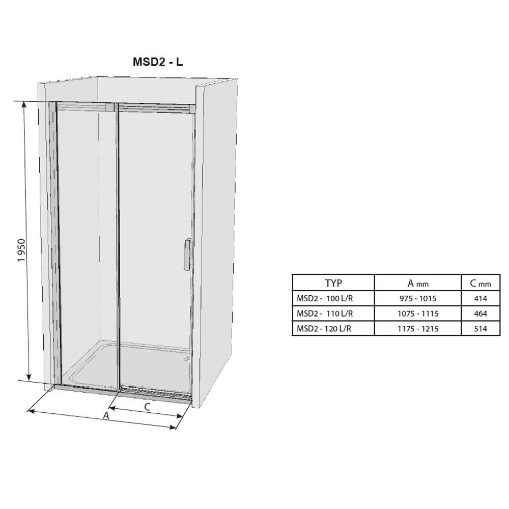 Душевые двери Ravak Matrix MSD2 - состоит из двух частей, одна из которых образует раздвижные двери. Левый или правый варианты открывания дверей определяются тем, на какой стороне, при виде снаружи, находятся петли.