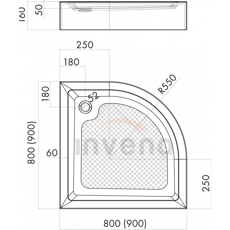 - 90 x 90 х 16 см, глубина 5 см, сливное отверстие 5.2 см, радиус кривизны R55