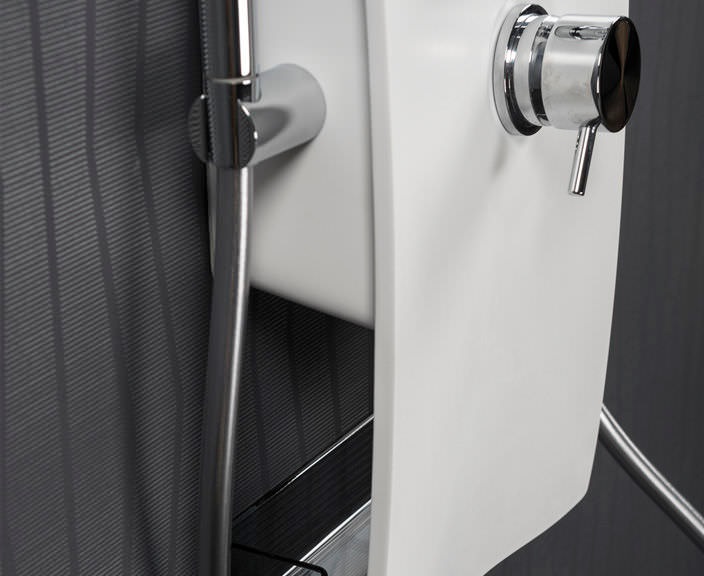 - Комплектация: ручной душ, ливневый душ, скрытые полочки для косметики, душевой смеситель, дюзы для гидромассажа с 3 разными форсунками