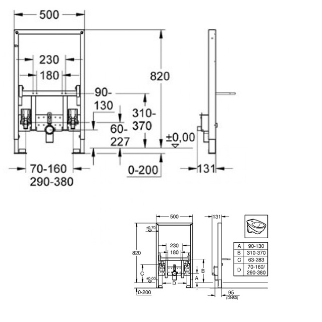 - 2 болта-держателя для биде, смывное колено стойкое к высоким температурам, DN 50, 2 звукоизоляционных подключения для смесителя DN 15, уплотнение 32 мм, без принадлежностей для монтажа перед стеной