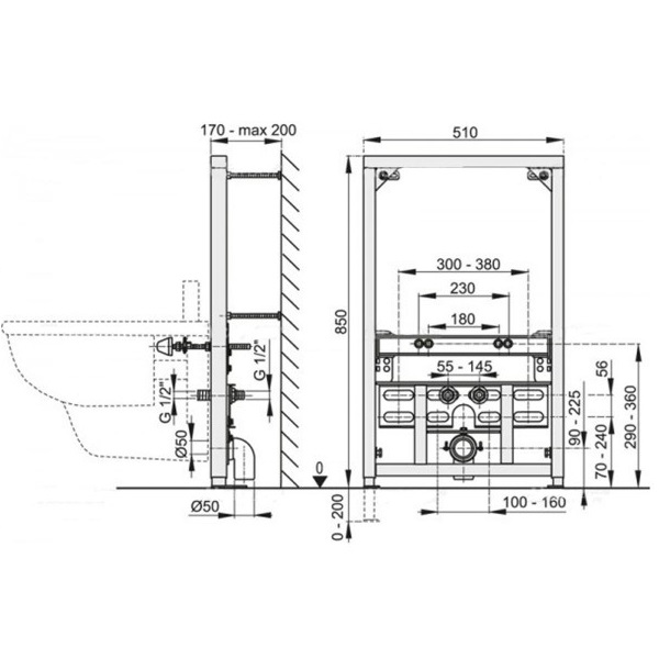 - - комплектация: самонесущая рама, монтажный набор: шуруп Ø8х60, дюбель Ø12 - 4 шт., монтажный набор для крепления унитаза: шпилька М12 - 2 шт., шайба - 4 шт., колпачок - 2 шт., гайка - 2 шт., гофрированный рукав - 2 шт., резьбовое соединение для подключения воды: G1/2"-G1/2", стоковое колено HT50 с прокладкой