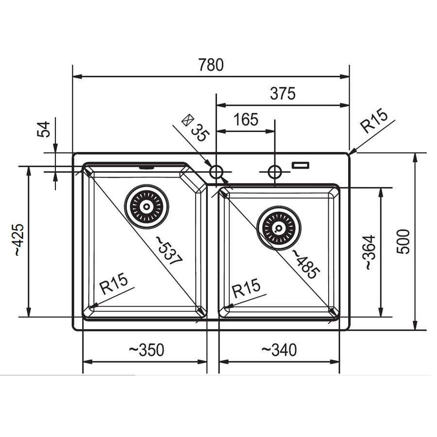 - общий размер 780 x 500 х 220 мм, размер чаш: 350 х 425 х 200 мм, 340 х 365 х 200 мм