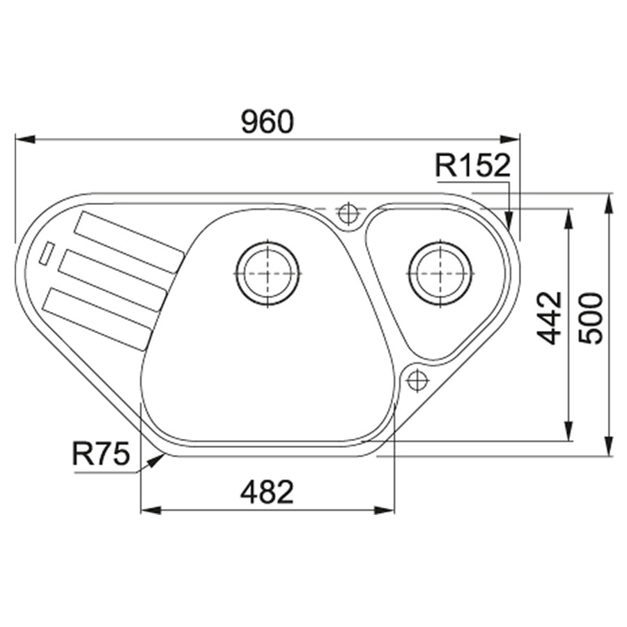 - общий размер 960 x 500 х 200 мм, размер чаш: большая - 482 х 442 х 200 мм, маленькая - R 152 мм