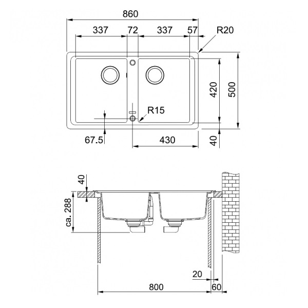 - общий размер 860 x 500 х 200 мм, размер чаш: 337 х 420 х 200 мм, 337 х 420 х 200 мм