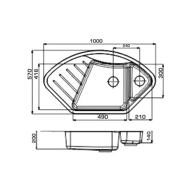 - 1000 х 570 х 200 мм, чаша 490 х 416 х 200 мм / 210 х 300 х 140 мм, ширина крыла 240 мм