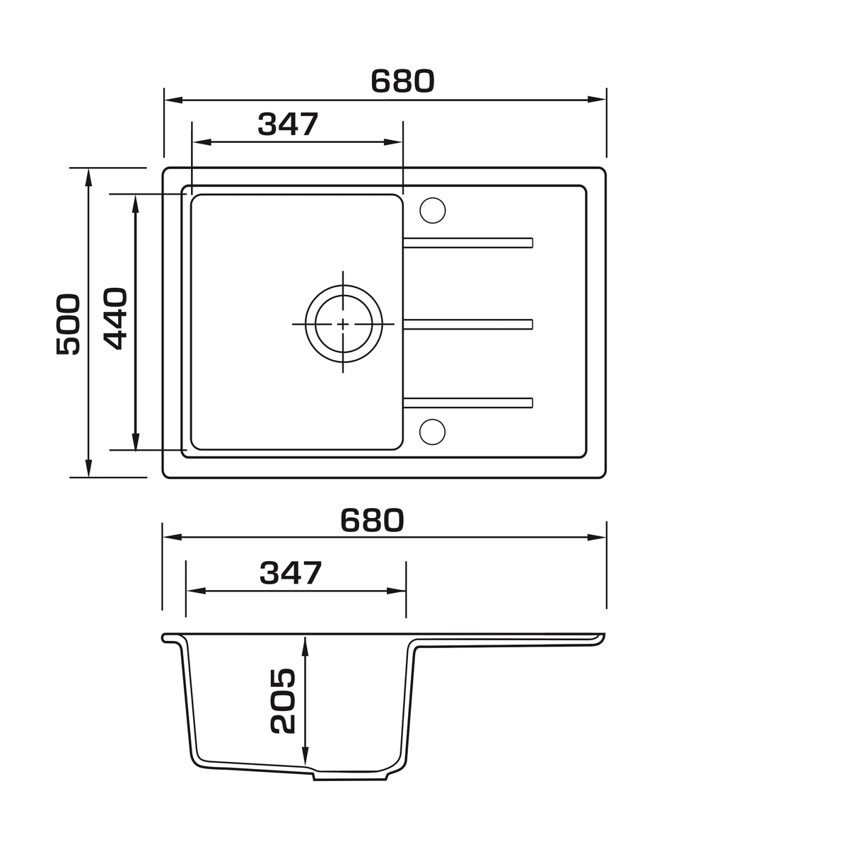 - общий размер 680 х 550 мм, чаша 347 х 440 мм, глубина 205 мм, ширина крыла 320 мм