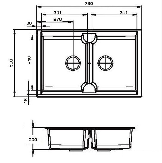 - общий размер 780 х 500 х 200 мм, чаша 341 х 410 х 200 мм / 341 х 410 х 200 мм