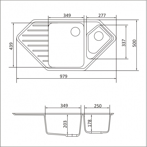 - общий размер 980 х 500 х 200 мм, основная чаша 349 х 439 х 203 мм, дополнительная чаша 250 х 337 х 178 мм