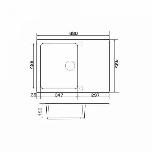 - общий размер 680 х 500 мм, чаша 345 х 465 мм, глубина 195 мм, крыло 297 х 345 мм