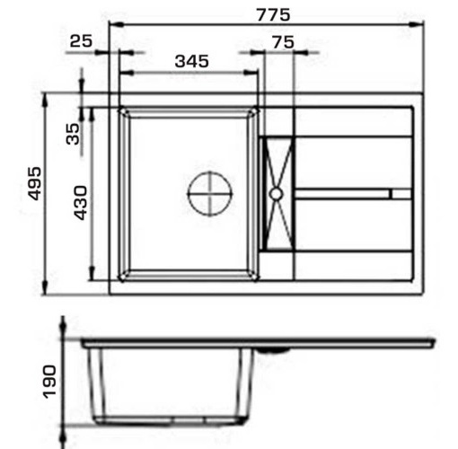 - общий размер 775 х 495 мм, чаша 345 х 430 мм, глубина 190 мм, ширина крыла 330 мм