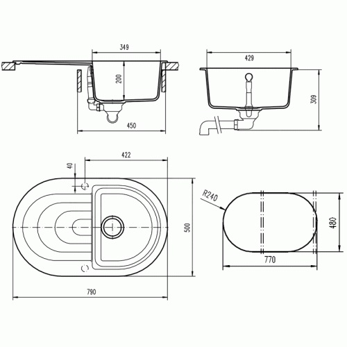 • общий размер: 790 х 500 мм, размер чаши: 345 х 430 x 200 мм