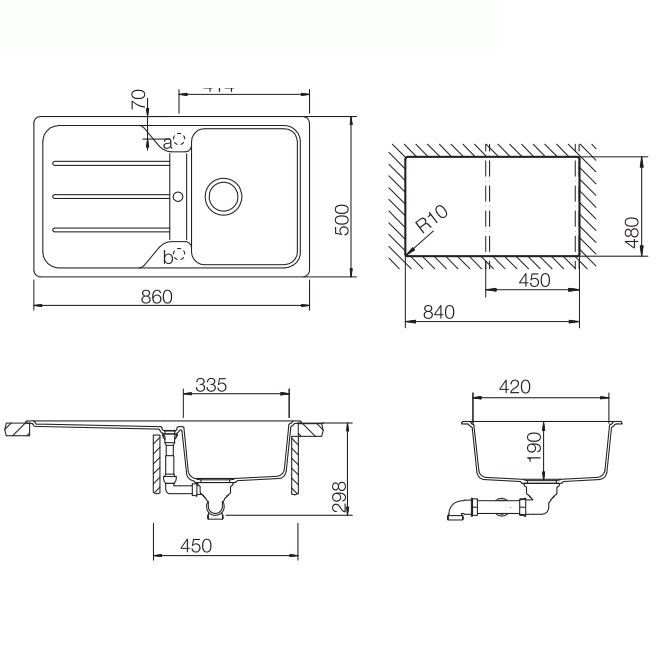 - общий размер: 860 х 500 х 190 мм, размер чаши: 335 х 420 x 190 мм