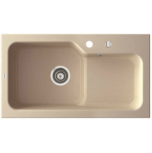 Врезная мойка с полуторной чашей и небольшим крылом. В комплект также входит сливная арматура, канализационный сифон и автоматический клапан. Возможна установка измельчителя отходов.