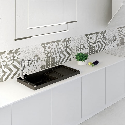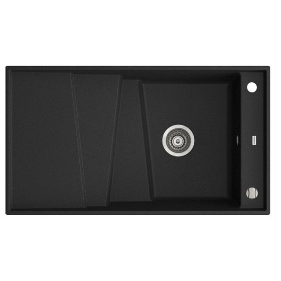 Врезная мойка с одной чашей и крылом. В комплект также входит сливная арматура, канализационный сифон и автоматический клапан. Возможна установка измельчителя отходов.