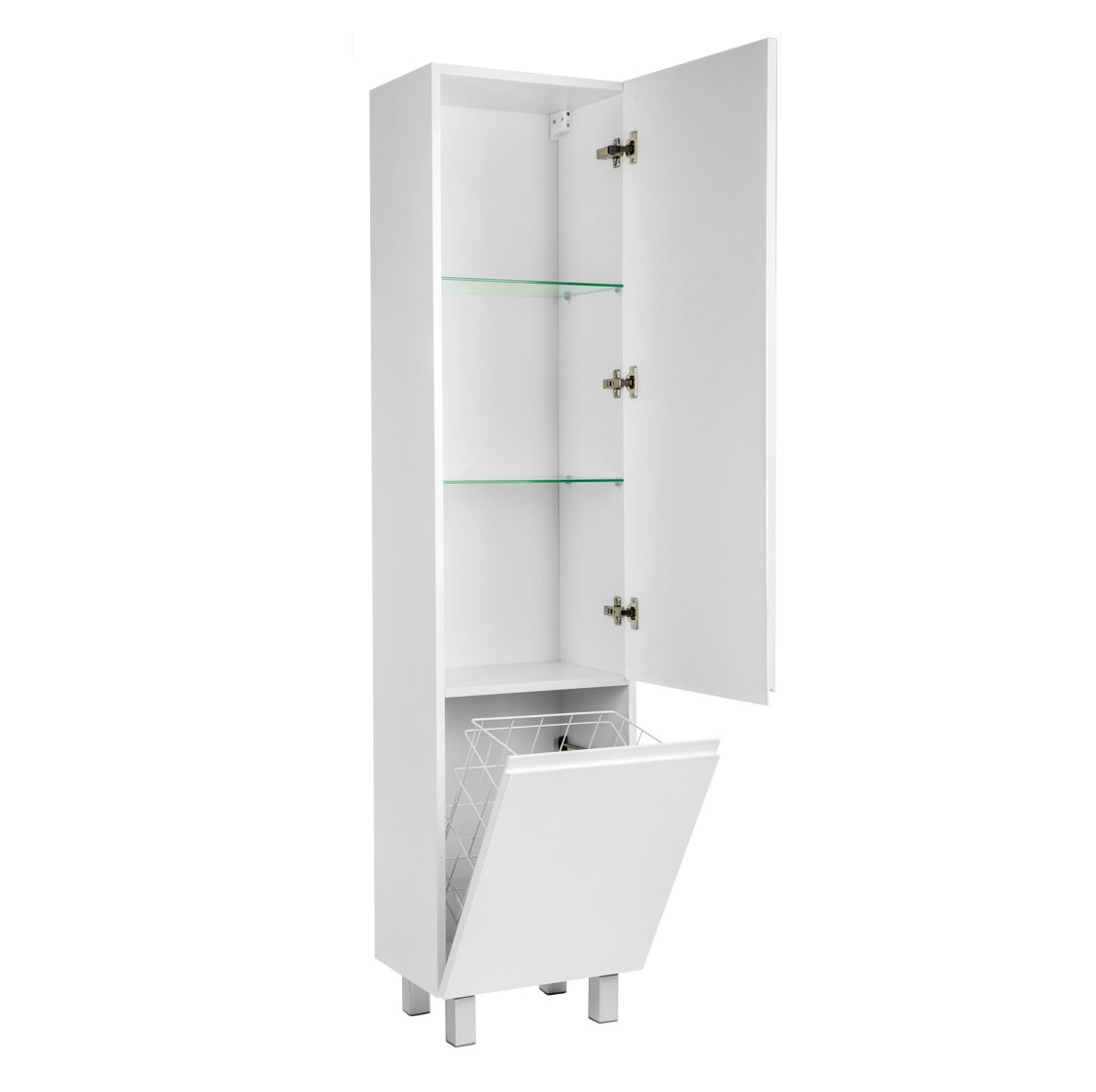 - левое / правое открывание дверей, сверху - распашная дверца, внутри 2 стеклянные полки + 1 полка из ДСП, нижняя часть - откидная дверца с бельевой корзиной (выдвижная)