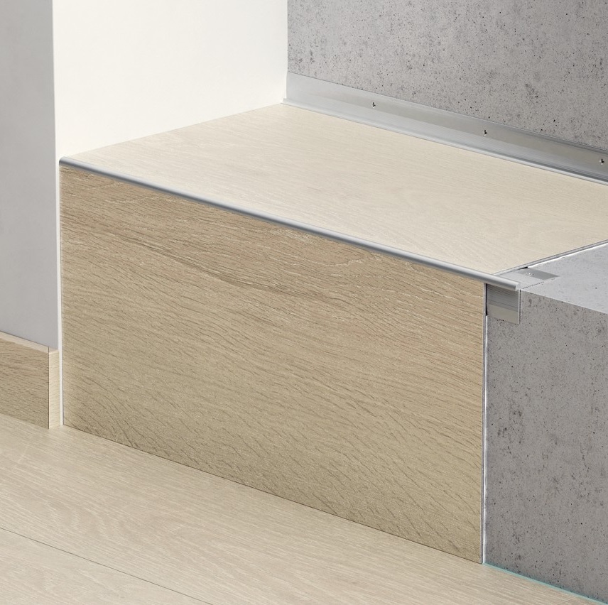Алюминиевый отделочный профиль для внутренних углов лестниц и ступеней для клееных виниловых полов с максимальной толщиной 2.5 мм. Способ крепления - клей.