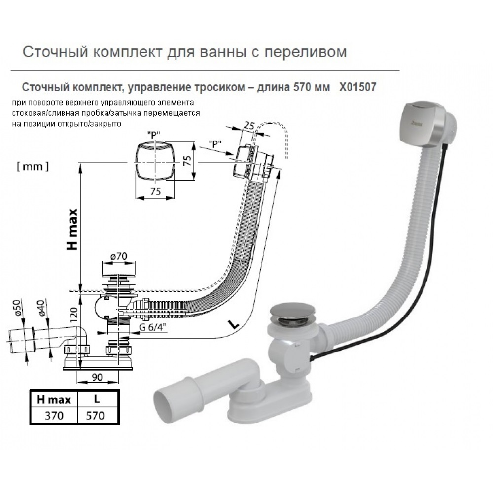 Сифон для ванны, предназначен для всех типов ванн, поверхность крышки перелива и слива покрыта хромом. Управления: тросиком, полуавтоматический.