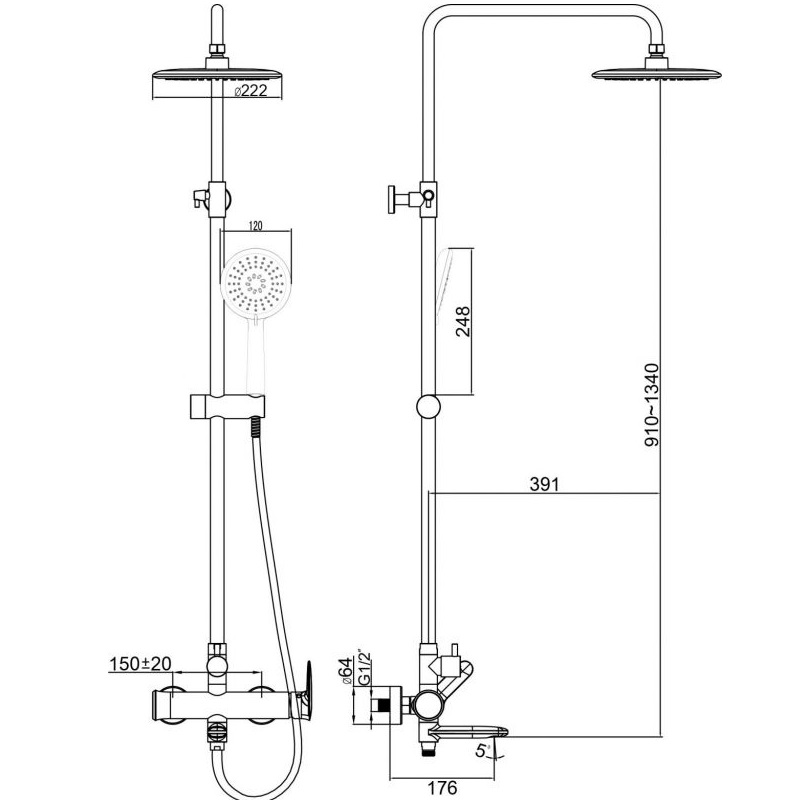 - - диаметр верхнего душа 222 мм