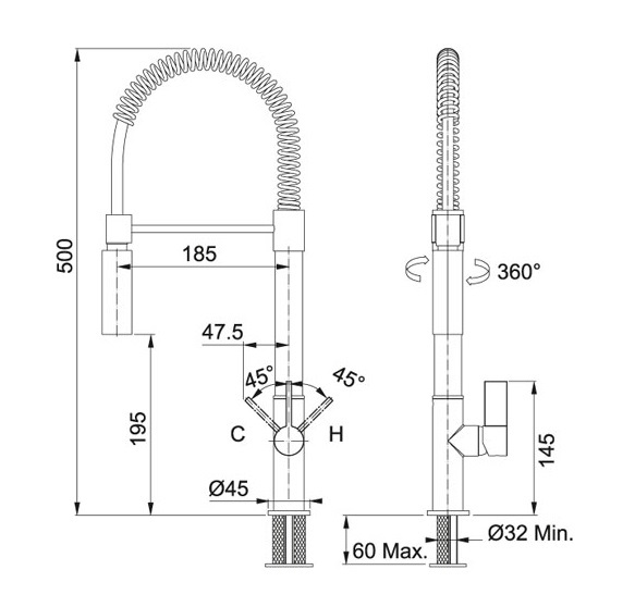 - общая высота 500 мм, поворотный гибкий излив 360°: высота 195 мм, длина 185 мм