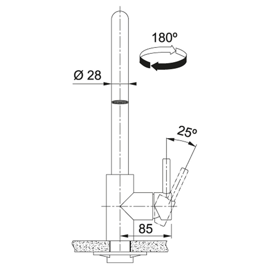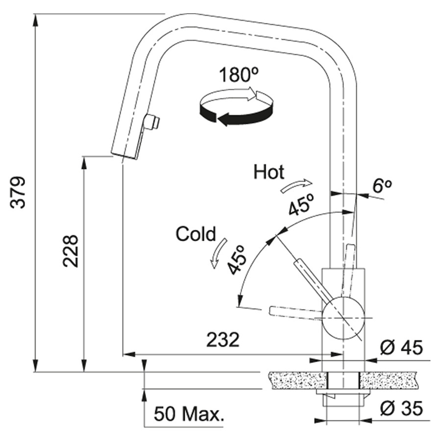 - общая высота 379 мм, поворотный излив 180°: высота 228 мм, длина 232 мм