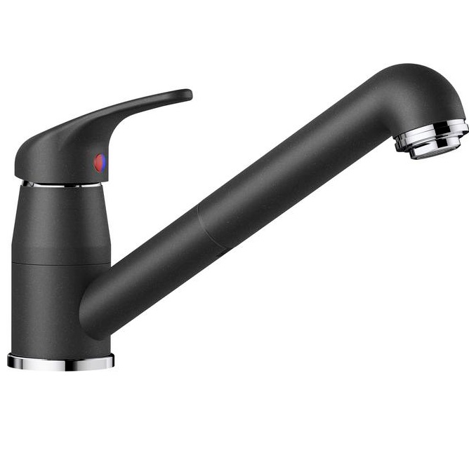 - общая высота смесителя 150 мм, поворотный излив 90°: высота 160 мм, длина 214 мм, шланг выдвижного излива в нейлоновой оплетке
