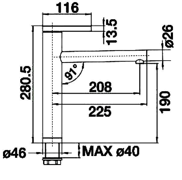 - общая высота 281 мм, поворотный излив 360°: высота 190 мм, длина 225 мм, длина рукоятки 116 мм