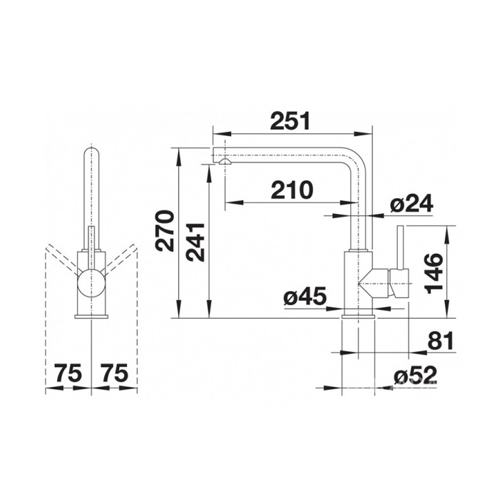 - общая высота смесителя 270 мм, поворотный излив: высота 241 мм, длина 210 мм