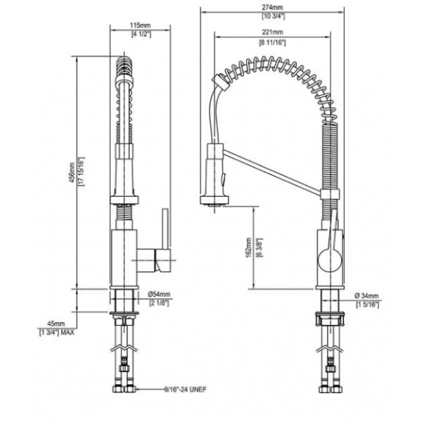 - общая высота: 456 мм, поворотный излив на 180º: высота 162 мм, длина 221 мм, выдвижной шланг 510 мм