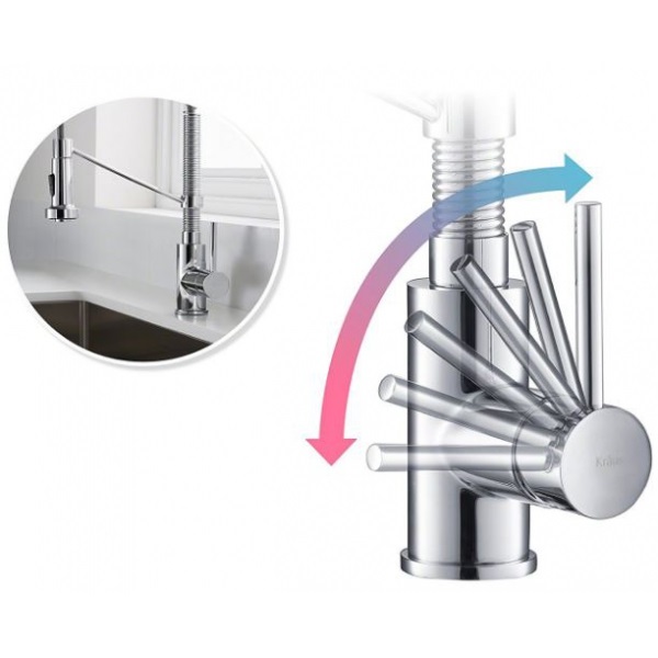 - пружинный излив и открытый носик промышленного типа, а также прочный держатель для лейки придают домашней кухне профессиональный вид и стиль, гибкий выдвижной шланг отличается плавной ретракцей (втягиванием) и удлиненным диапазоном действия