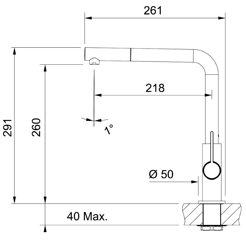- общая высота смесителя 291 мм, излив: высота 260 мм, длина 261 мм