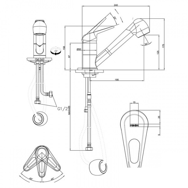 - общая высота смесителя 175 мм, поворотный излив 120°: высота 125 мм, длина 195 мм