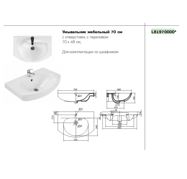 - умывальник Kolo Runa 70 (Украина), 700 х 480 мм, с переливом