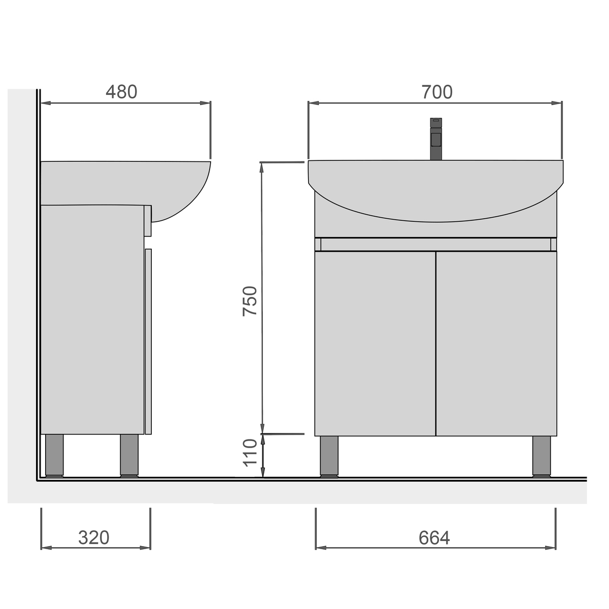 - размер тумбы с умывальником: ширина 700 мм, высота 860 мм (с ножками), глубина 480 мм