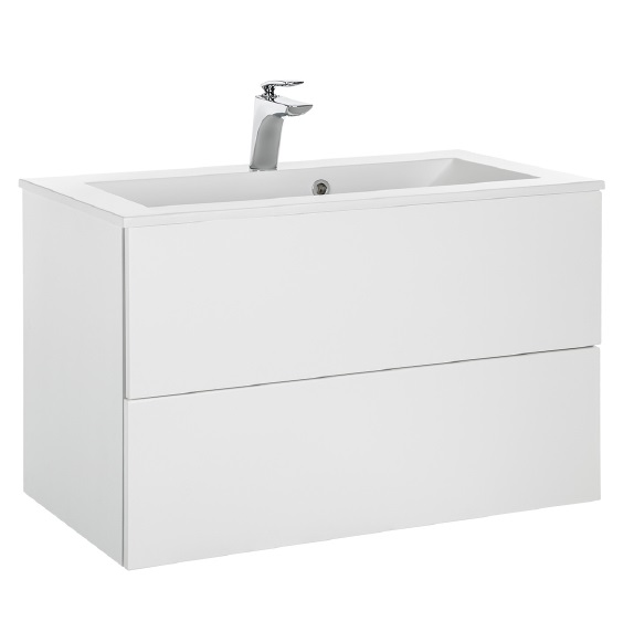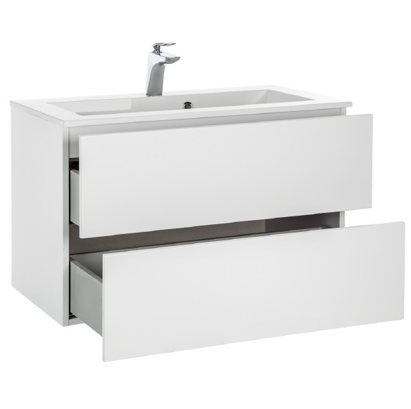 - фасад - влагостойкий окрашеный МДФ 19 мм (покрытие эмаль), корпус - влагостойкий ДСП 16 мм, фурнитура Blum Австрия, 2 выдвижных ящика с доводчиками, цвет: белый матовый