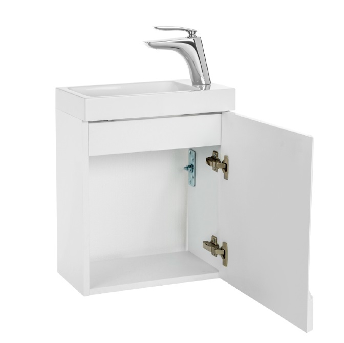 - фасад - влагостойкий окрашеный МДФ 19 мм (покрытие эмаль), корпус - влагостойкий ДСП 16 мм, фурнитура Blum Австрия, 1 распашная дверца (петли справа)