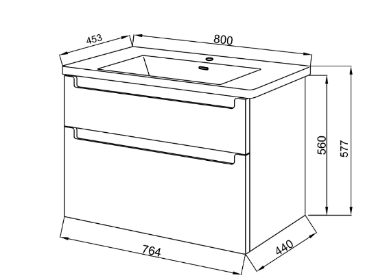 - размер тумбы с умывальником: ширина 802 мм, высота 605 мм, глубина 455 мм