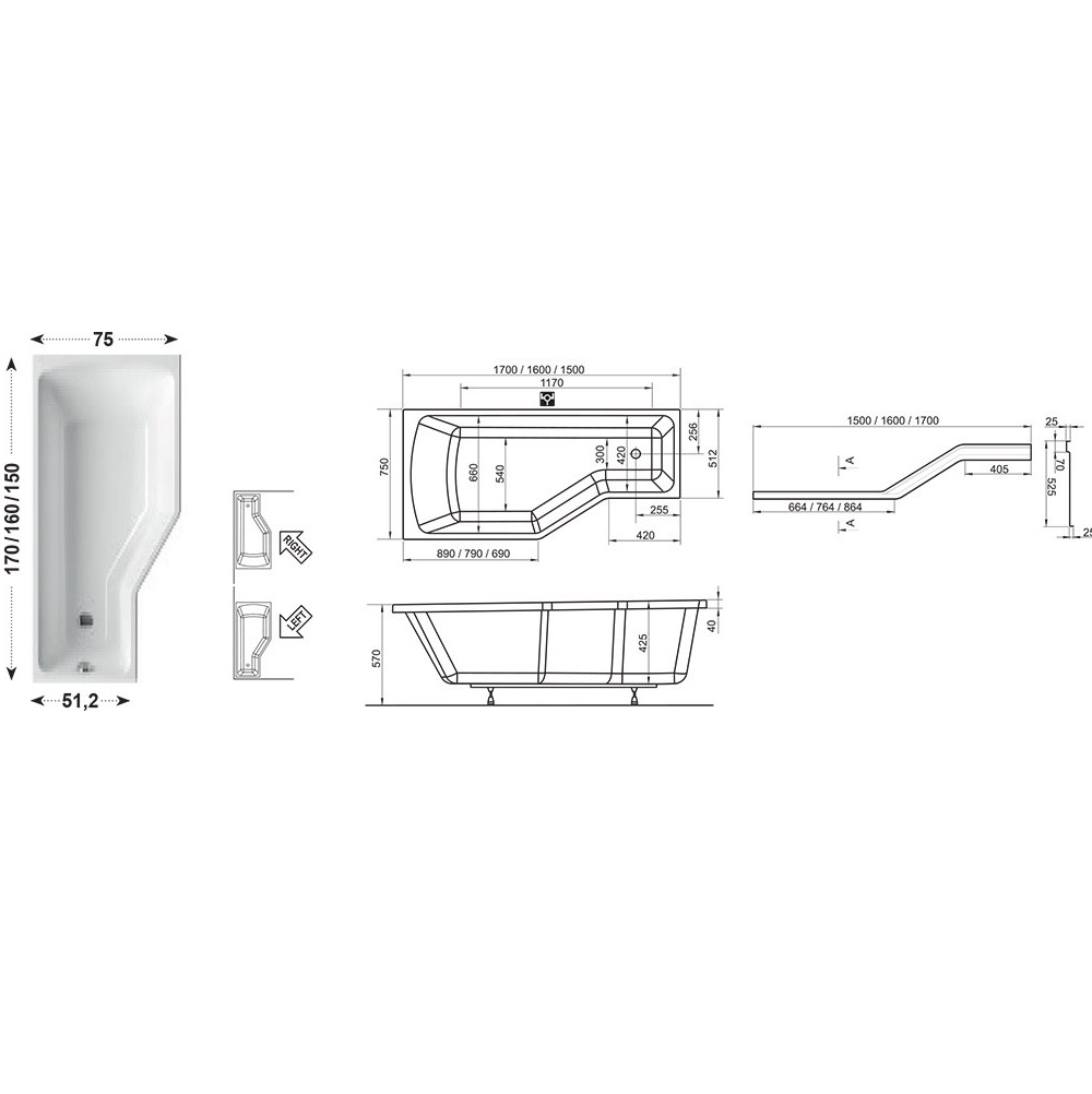 - додаткові опції: шторка для ванни: VS3, фронтальна/бічна панель, зливний комплект для ванн 570 мм, ніжки (опора для ванн)