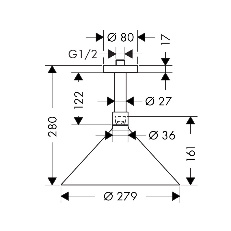 - Розмір Ø 280 мм, довжина кронштейна 400 мм, довжина стельового під'єднання 280 мм