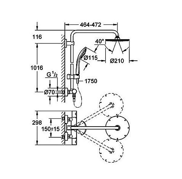 Душова система з термостатом Grohe Euphoria 210, сумісна з проточним водонагрівачем від 18 кВ/год.